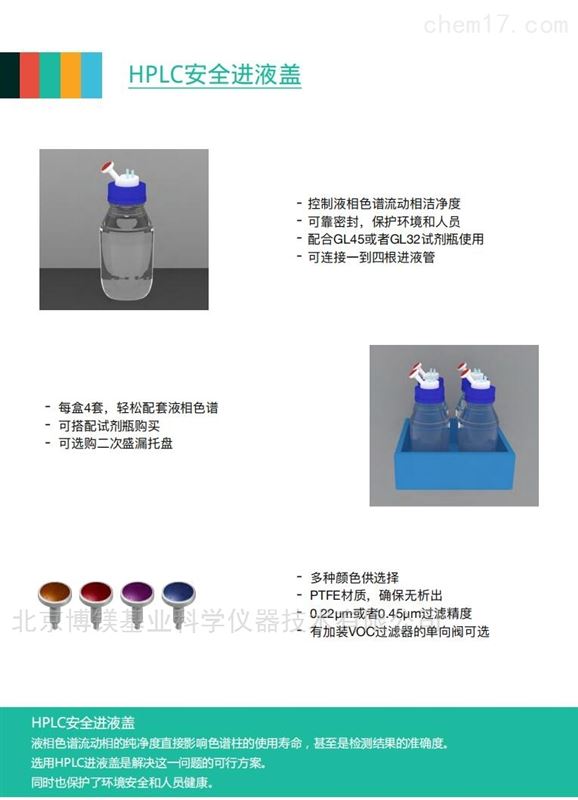 ERTAREE埃爾塔HPLC安全進液蓋-控制液相色譜流動相潔凈度-可靠密封,保護環(huán)境和人員-配合GL45或者GL 32試劑瓶使用-可連接*-到四根進液管-每盒4套,輕松配套液相色譜可搭配試劑瓶購買:-可選購二次盛漏托盤多種顏色供選擇PTFE材質(zhì),確保無析出.- 0.22μm或者0.45μm過濾精度-有加裝VOC過濾器的單向閥可選