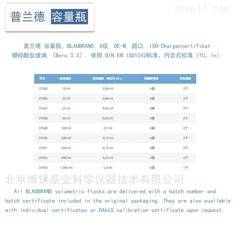 德國普蘭德圓口容量瓶BLAUBRAND®DE-M37046普蘭德 容量瓶, BLAUBRAND®, I級, DE-M, 硼 3.3, 圓口, ISO-Chargenzertifikat